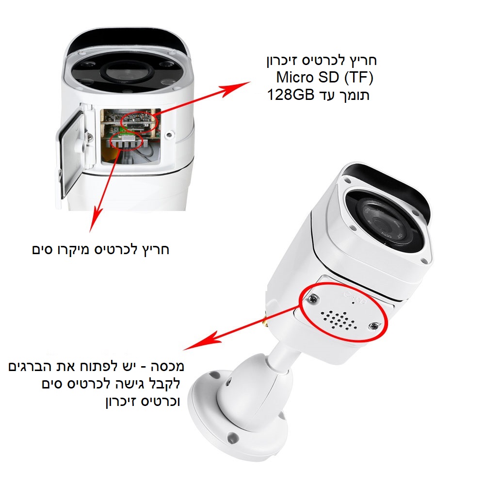- המצלמה תומכת בקישוריות 3G ו 4G עם כרטיס מיקרו סים